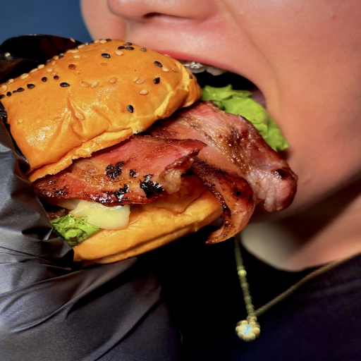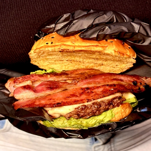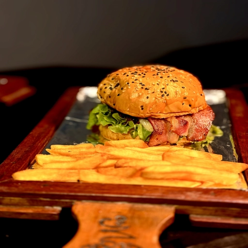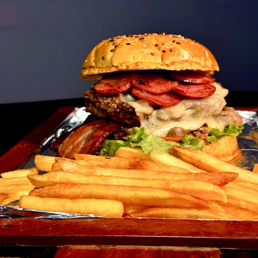Pão, carne, mussarela, bacon, salada e batata palha.