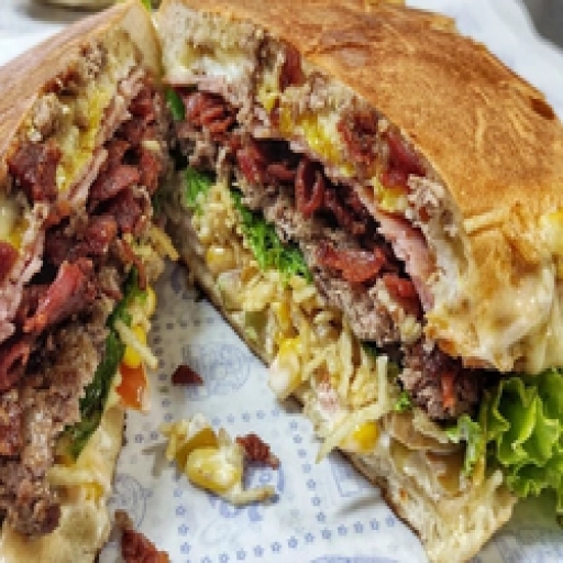 Pão bola, 2 carne, 2 queijo, 2 presunto, salsicha, ovo, bacon, calabresa, salada e batata palha (lanche grande que serv... Ver completo