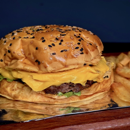 PÃO BRIOCHE, CARNE 160G, MUSSARELA, REQUEIJÃO, CHEDDAR E SALADA.